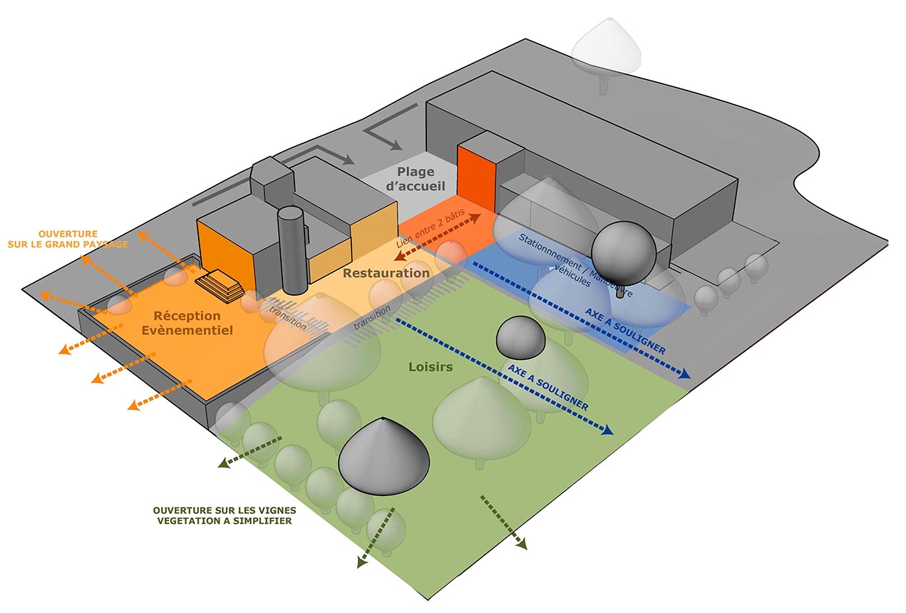Différencier, hiérarchiser et mettre en relation les espaces bâtis et extérieurs selon leurs usages : restaurant, bureaux, chais et cuvier, accueil